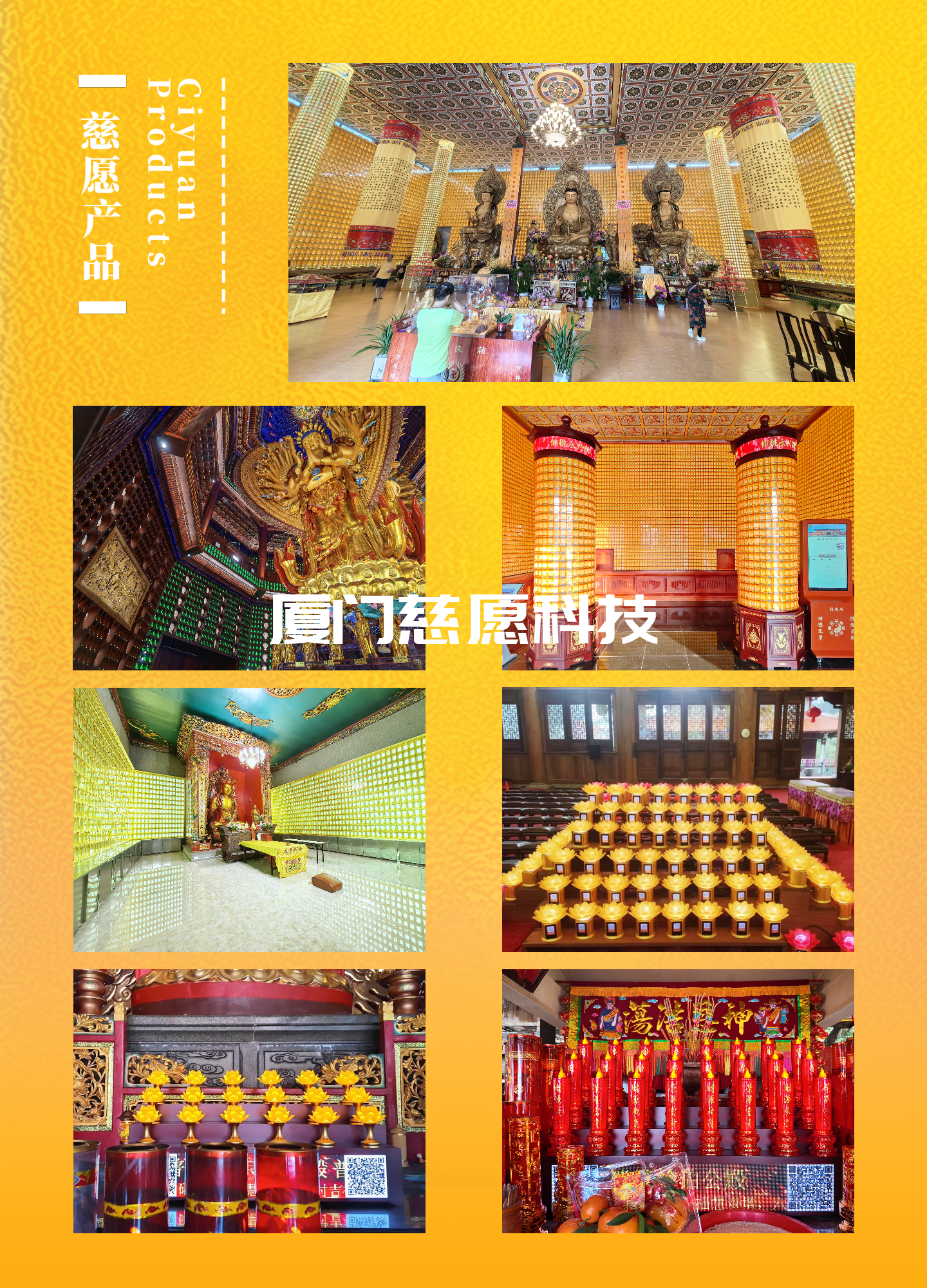 廈門慈愿網絡科技為寺院量身打造寺院信息管理系統(包括:掛單管理、牌位打印、法會管理、 財務管理等功能)、智能祈福燈/光明燈、智能萬佛墻、祈福牌位、寺院捐贈系統、電子蠟燭臺、電子功德箱、智能骨灰存放架等自主產品。為陵園提供 遠程祭拜系統、智能骨灰存放架、智能骨灰存放業務管理軟件、智能祭祀廳等知名產品。為行業廠家及經銷商提供佛具用品采購平臺。